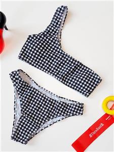 لباس شنا زنانه دو تیکه مدل یک طرفه برند شین ( shein ) طرح چهارخانه مشکی و سفید رنگ