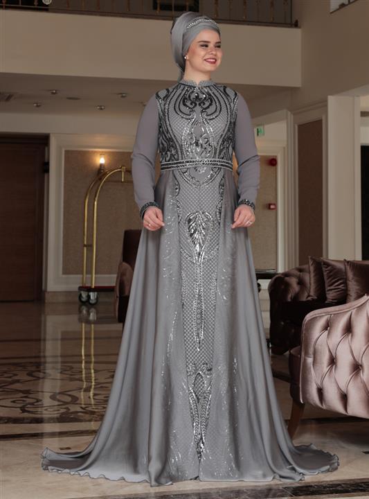 لباس مجلسی سایز بزرگ زنانه طوسی Saliha 296191