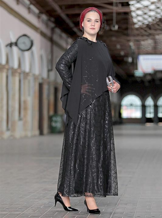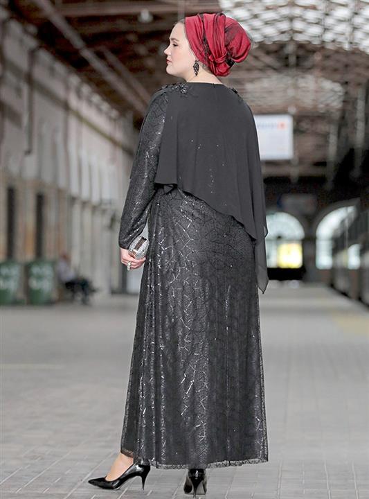 لباس مجلسی سایز بزرگ زنانه مشکی پولک دوز ابریشم شیفونی شنل دار Nesrin Emniyetli 305812