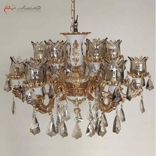 لوستر برنزی 12 شعله طرح نیلوفر، رنگ فورتیک چند لایه و تزیینات کریستالی شیک کد 6211