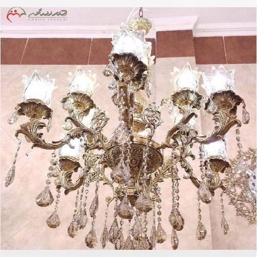 لوستر 12 شعله آرامیس، بدنه ی برنزی با سر شاخه و آویز های کری...