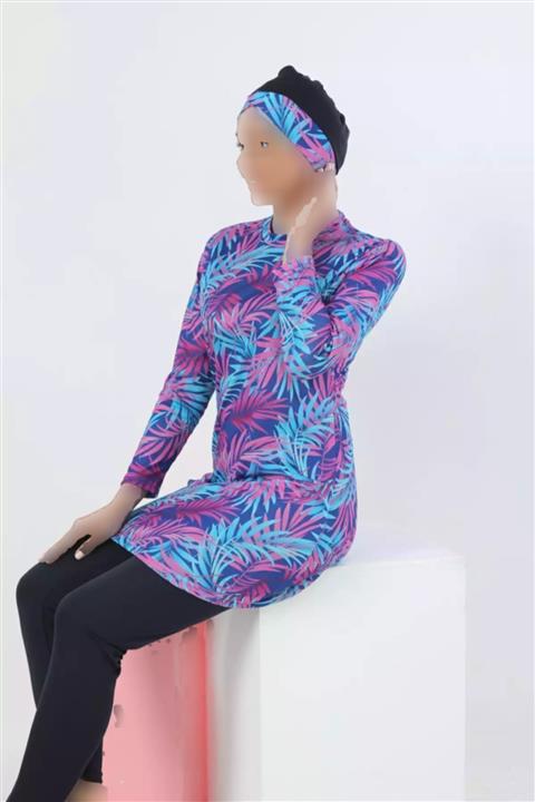 مایو اسلامی سرهمی و یکسره زنانه مشکی و آبی رنگ تمام پوشیده بدون کاپ و آستین بلند