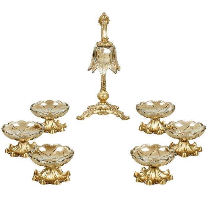 مجموعه هفت سین دارای 6 ظرف از جنس برنج و بلور و یک آباژور رومیزی برنزی به ابعاد : 35×15×15 و وزن :1/300 کیلو گرم است آبکاری این محصول آنتیک است و قابل شست و شو میباشد وزن هر ظرف حدود 200 گرم است . محصول فوق فاقد لامپ میباشد.