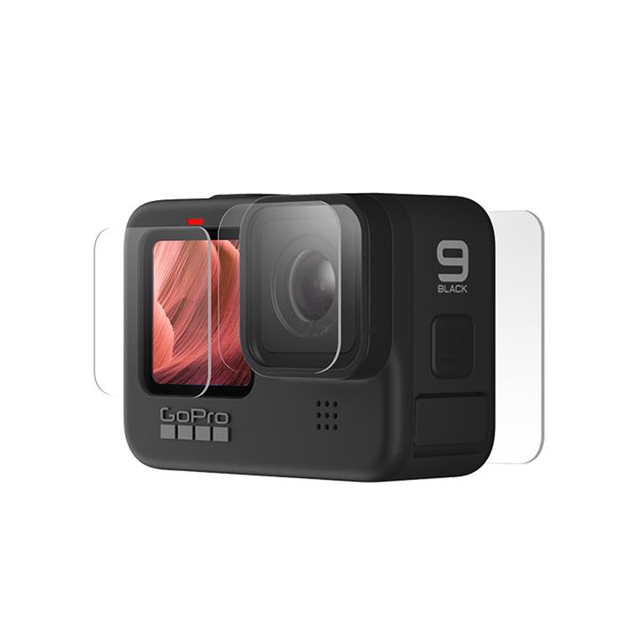 محافظ لنز و صفحه نمایش دوربین Gopro Hero 9\r\nمحافظ صفحه شیشه ای برای صفحه نمایش جلو و پشت دوبین / نمایشگر جلو\r\nتعداد محافظ صفحه : 3 عدد\r\nضخامت 2.5D\r\nمحافظت از خراش روی LCD\r\nفن آوری استاتیک که اثر حباب را روی LCD از بین می برد\r\nشفافیت بالا با وضوح 99.5٪