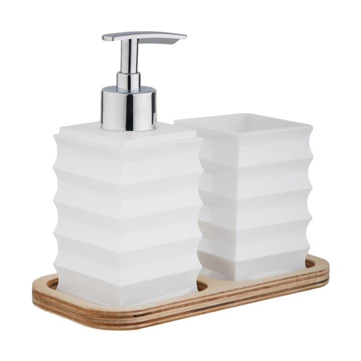 - دارای استند چوبی به ابعاد 19×1×9 سانتیمتر و وزن 70 گرم\r\n- دارای مخزن مایع دستشویی به ابعاد 6×17×6 سانتیمتر و وزن 160 گرم\r\n- دارای جا مسواکی به ابعاد 6×10×6 سانتیمتر و وزن 130 گرم \r\n