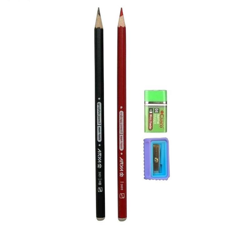1 عدد مداد مشکی آریا یک عدد مداد قرمز آریا همراه با پاکن کنکو و تراش پیکاسو