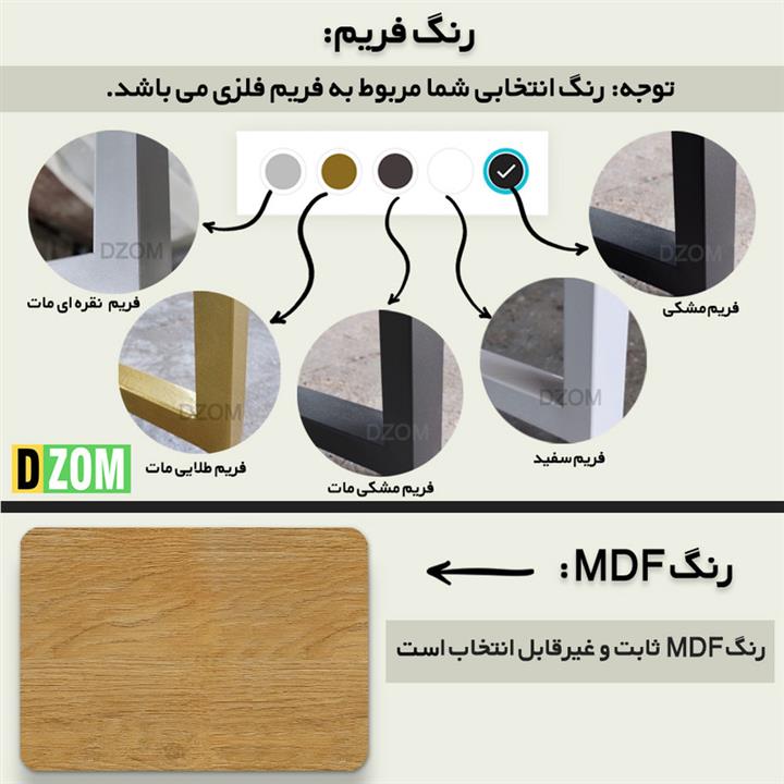 جنس صفحه MDF درجه یک با رویه ضد آب می باشد. پایه های فلزی جوشکاری شده و یکپارچه بدون لقی (نسبت به اتصالات پیچ و مهره) پوشش رنگ فلز: رنگ کوره ای الکتروستاتیک (یکنواخت، ضد خش و بسیار با کیفیت) محصول مونتاژ شده و آماده استفاده ارسال میگردد.