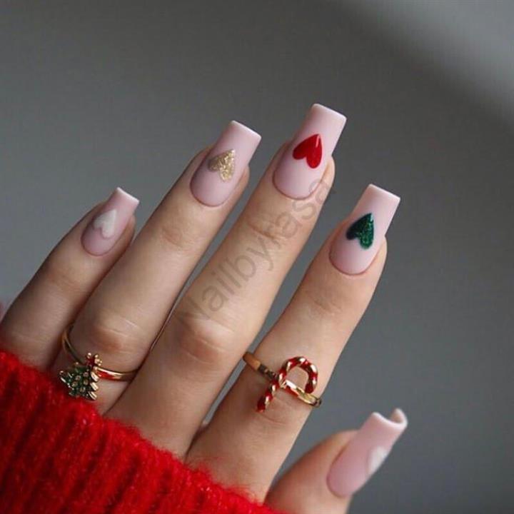 ناخن مصنوعی طرح قلبهای رنگی کریسمس (قرمز، سبز، طلایی) روی ب...