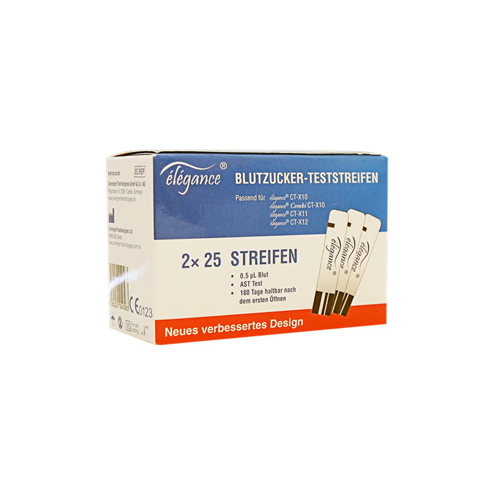 نوار تست قند خون الگانس حاوی 50 عدد نوار تست قند خون است و قابلیت عملکرد با دستگاه های تست قند خون الگانس مدل های CT-X10، CT-X11 و CT-X12 را دارند.