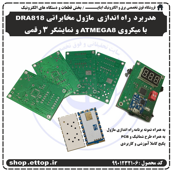 هدربرد راه اندازه ماژول مخابراتی DRA818 با میکروی ATMEGA8 و نمایشگر 3 رقمی (به همراه لوازم جانبی)