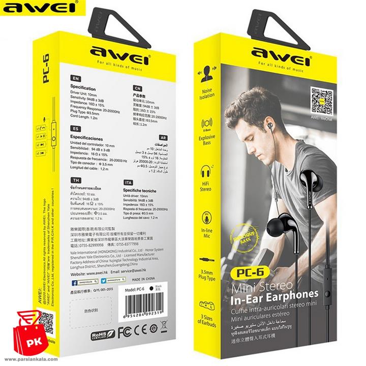 مشخصات فنی هندزفری اورجینال AWEI مدل PC-6