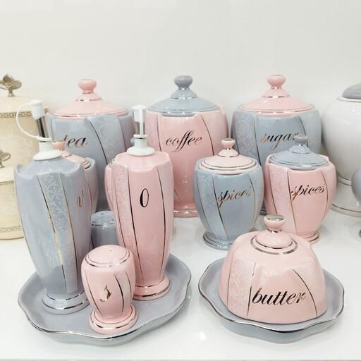پاسماوری و جاادویه ای مارک پرستیژ مدل استیج طرح دار رنگ طوسی صورتی مناسب جهیزیه سرویس 21 پارچه ارسال بصورت پس کرایه