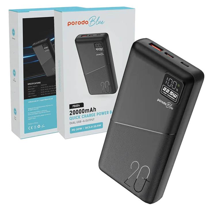 پاوربانک 20000mAH فست Porodo Blue LCD 22.5w PD&QC pb054