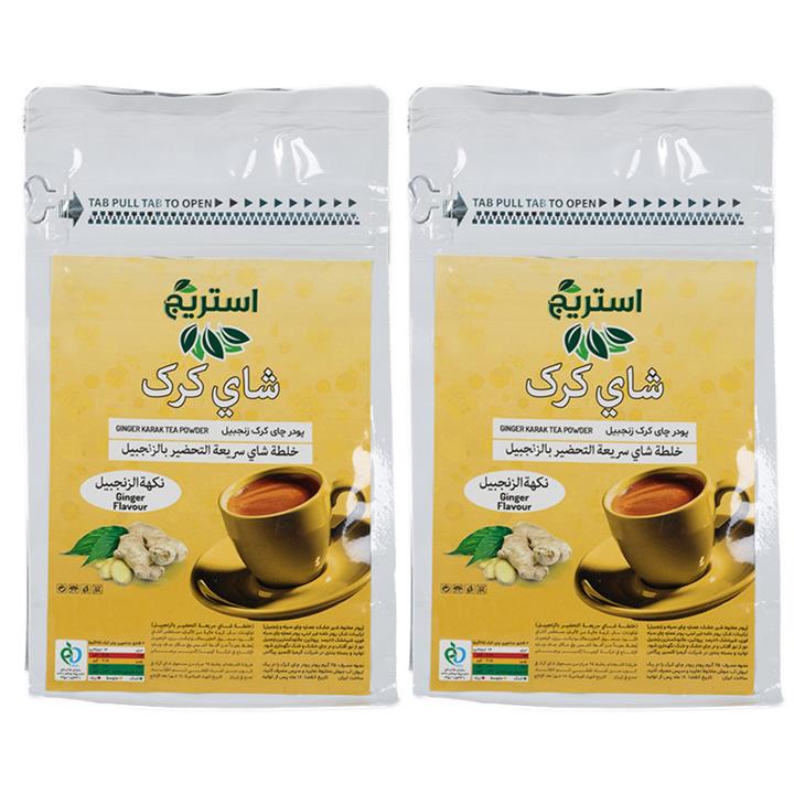 پودر چای کرک زنجبیل استریج _ 300 گرم مجموعه دو عددی\n ( پودر مخلوط شیر خشک، عصاره چای سیاه و زنجبیل ) ترکیبات: شکر، پودر خامه غیر لبنی، پودر عصاره چای سیاه فوری، شیر خشک 18 درصد پروتئین، مالتودکسترین، زنجبیل\nنحوه مصرف : 25 گرم پودر چای کرک را در یک لیوان آب جوش مخلوط نمایید و سپس مصرف کنید.\nدور از نور آفتاب و در جای خشک و خنک نگهداری شود