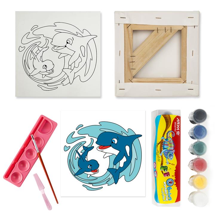 گواش شش رنگ آریا به همراه پالت چهار خانه برای ترکیب رنگ ها، یک عدد کاردک پلاستیکی، یک قلم مو برای رنگ آمیزی، تصویر کارتونی سیاه و سفید چاپ شده بر روی تابلو بوم با سایز 25 x 25 و با ضخامت 5/1 سانتی متر و همچنین یک عکس چاپ شده رنگی بر روی کاغذ کوتد از طرح روی بوم برای راهنمایی کودکان در رنگ آمیزی