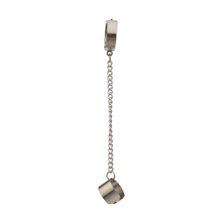 پيرسينگ از جنس استیل نقره ای قطر زنجیر 1 میلیمتر و طول زنجیر 5 سانتیمتر و ابعاد حلقه آن 1 در 1 سانتیمتر می باشد. پیرسینگ از یک قسمت حلقه ابتدایی توسط قفل باز شده و پس از عبور میله از سوراخ گوش مجدداً بسته می شود وسمت دیگر به صورت فنری به قسمت دیگر گوش متصل میشود. این نوع پیرسینگ بخاطر شکل خاص آن جلوه زیبایی به گوش می دهد.