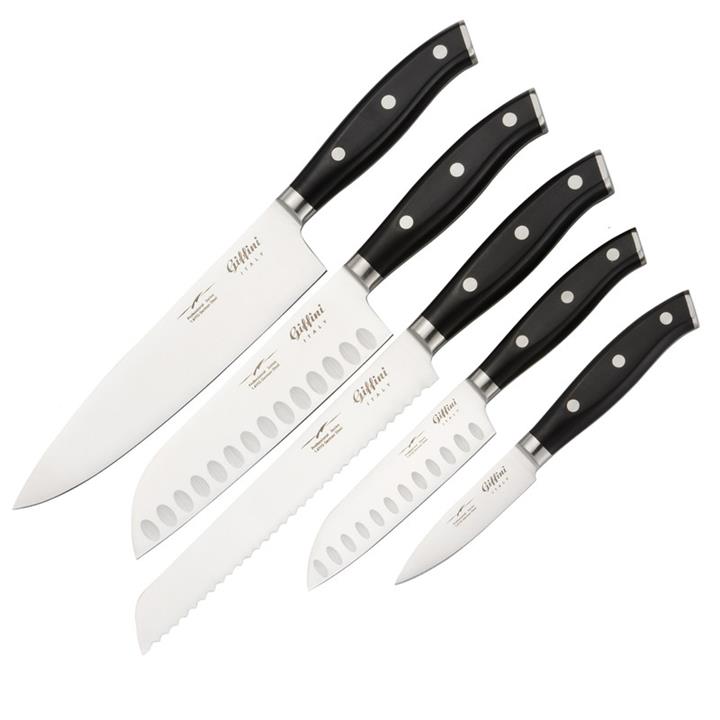 - تیغه وانادیوم تیز شده بوسیله لیزر دقیق \r\n- ضریب تیزی 14(بسیار بسیار تیز) \r\n- دارای کارد دم دستی، گوشت، سبزی و سرآشپز \r\n- چاقوی بسیار تیز و عالی \r\n- چاقو مخصوص حرفه ایها \r\n- دارای دسته و بدنه یک تکه \r\n- داران وزن مناسب و عالی \r\n- دارای کارد سر اشپز برای کار کردن سریع و نچسبیدن در موقع برش زدن.مانند برش گوجه فرنگی \r\n - دسته بسیار خوش دست \r\n- اصل GIFFINI \r\n- یک چاقو برش به طول 24.5 سانتیمتر \r\n- یک چاقو برش به طول 33.5 سانتیمتر\r\n - یک چاقو سرآشپز به طول 33 سانتیمتر \r\n- یک چاقو برش نان و محصولات فریز شده به طول 33 سانتیمتر \r\n- یک کارد کوچک به طول 20 سانتیمتر