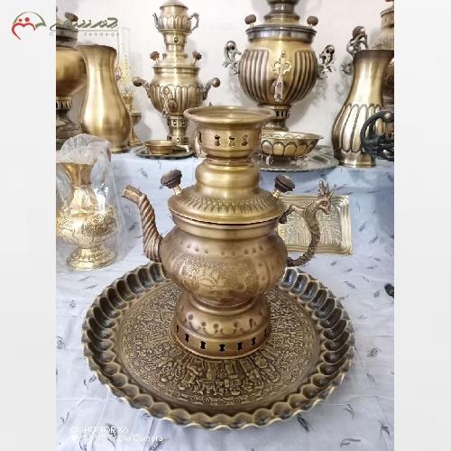 کتری برنجی طرح شکاری قلم کاری شده با دسته های گوزنی به همراه سینی قلم زنی شده