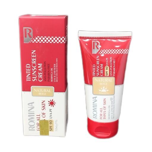 کرم ضدآفتاب رنگ بژ طبیعی SPF 90 رومینا حجم 50 میل\nROMINA TINTED SUNSCREEN FOR ALL TOYPS OF SKIN