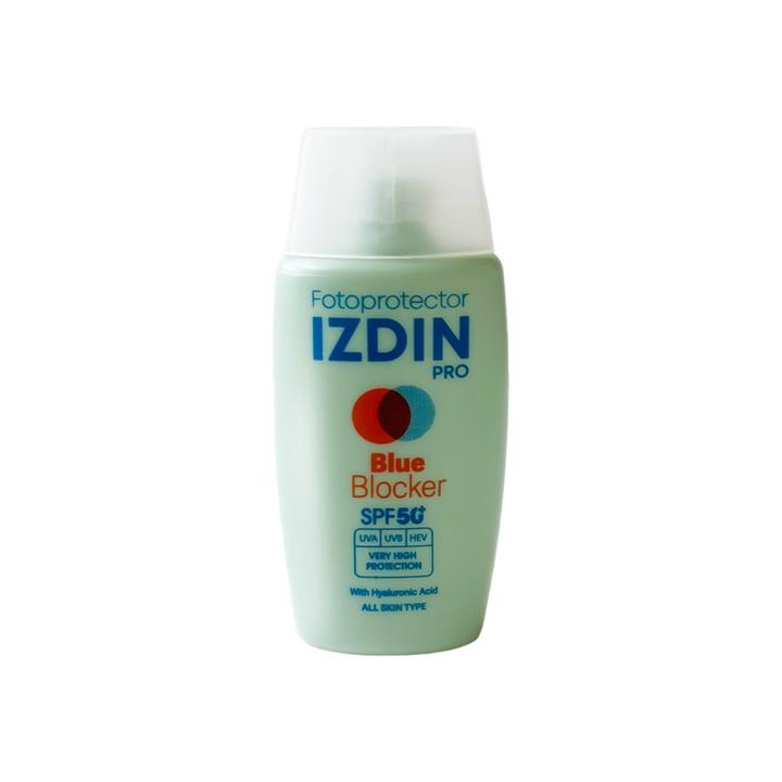 مشخصات فنی کرم ضد آفتاب بدون رنگ ایزدین SPF 50 مدل blue blocker مناسب انواع پوست حجم 50 میلیلیتر