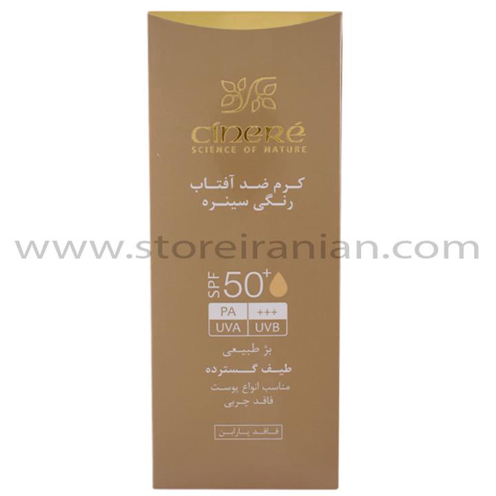 کرم ضد آفتاب رنگی سینره SPF50: دارای رنگ بژ روشن - حفاظت از پوسـت در برابر پرتوهای مضـر UVB و UVA- دارای پوشـش مشابه کرم پودر- حاوی عصاره نت گرس جهت محافظت از پوست در برابر اشعه مادون قرمز- دارای فیلتر های مورد تایید FDA- بدون ایجاد احساس سنگینی بر روی پوست- حاوی ویتامین E جهت پیشگیری و مهار اثر مخرب رادیکال های آزاد- دارای ترکیبات گیاهی ضد التهاب- فاقد پارابن- دارای فاکتور محافظتی +++PA