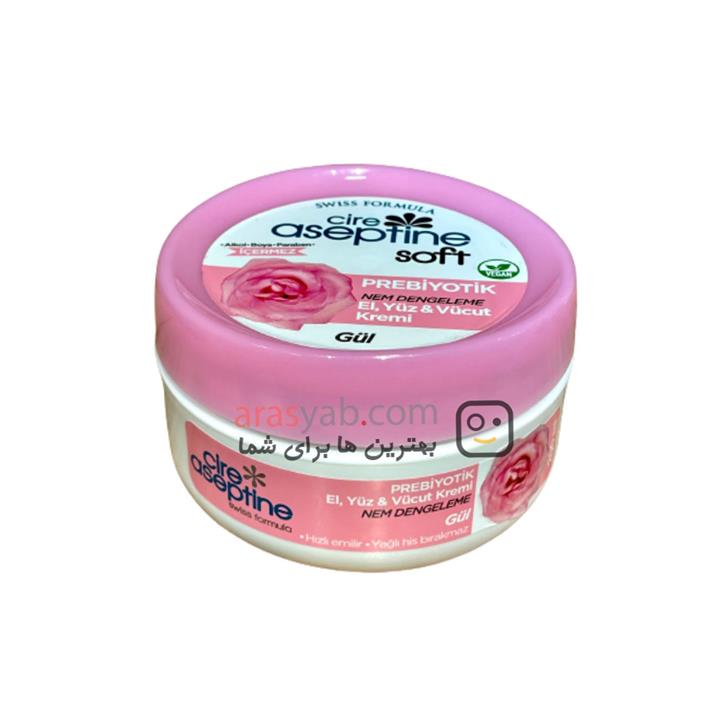 مشخصات فنی کرم مرطوب کننده آسپتین cire aseptine سری prebiyotik حاوی عصاره گل رز حجم ۲۰۰ میل