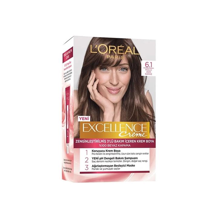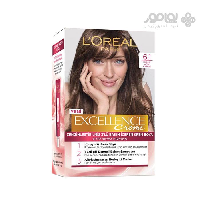 کیت رنگ مو لورال مدل Excellence شماره 6.1 رنگ قهوه ای دودی