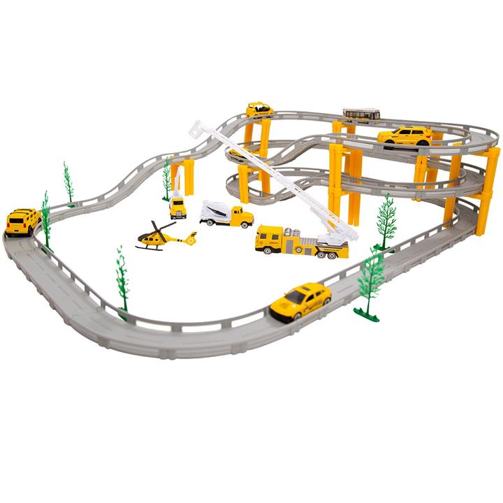 كيت ماشين بازي مدل Track Engineering شامل : - جاده اتومبيل مارپيچ به طول حدودا 5 متر - 6 عدد درختان كنار جاده - 16علامت رانندگي - 2 عدد اتومبيل فلزي امدادي - اتومبيل هاي فلزي سواري -1 عدد كاميون فلزي - 1 عدد اتوبوس فلزي -2 عدد ماشين سواري فلزي - 2 عدد اتومبيل باطري خور پر قدرت جهت چرخش در مسير -1 عدد هليكوپتر فلزي -1 عدد موتور سيكلت فلزي