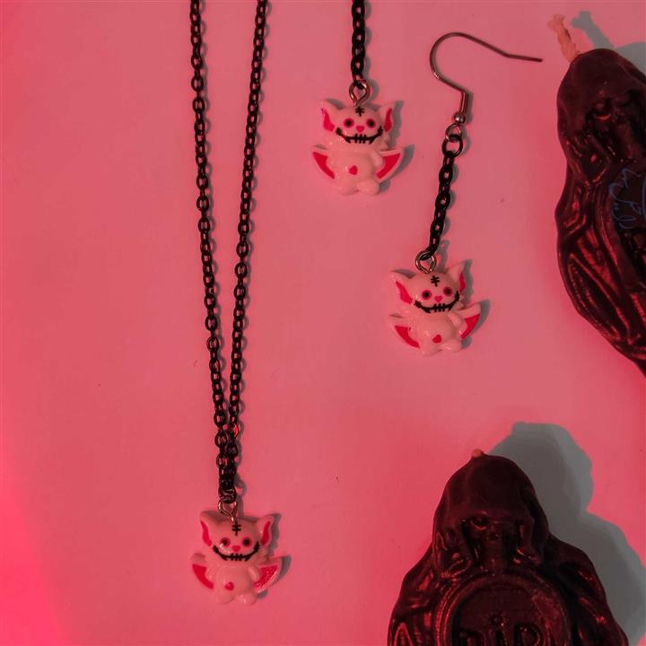 گردنبد و گوشواره زنجیر مشکی هالووینی گاثیک ایمو گربه خفاش دارک قلبی سفید