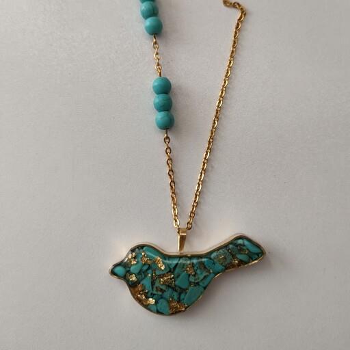 گردنبند رزینی مرغ آمین فیروزه و ورق طلا