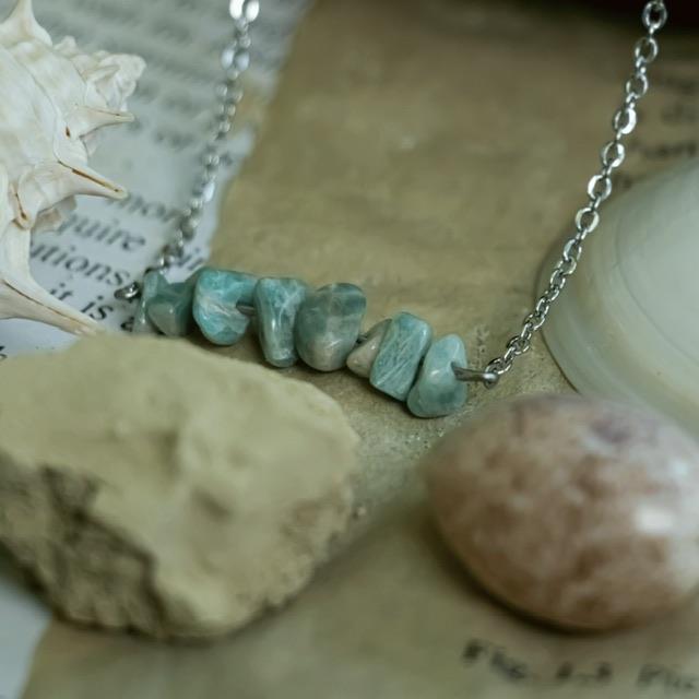 مشخصات فنی گردنبند سنگ آمازونیت چیپسی با زنجیر استیل رنگ ثابت ضد حساسیت