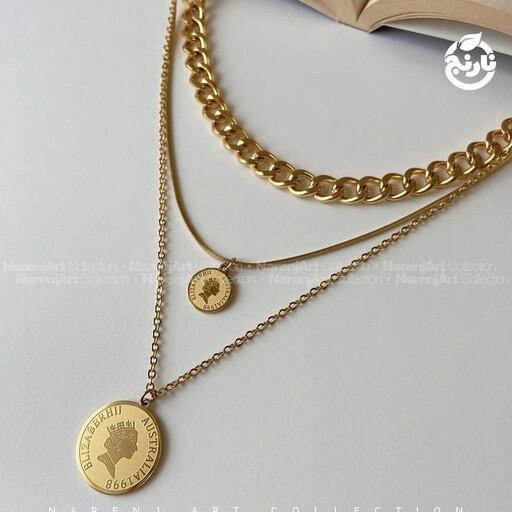 گردنبند سه لاین کارتیر استیل با زنجیر ماری ظریف و آویز الیزابت رنگ ثابت طلایی (لاوین گالری)