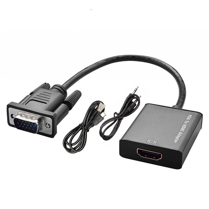 مبدل VGA نري به HDMI مادگي تبديل كننده پورت VGA كامپيوتر و نوت بوك و ساير دستگاه هاي پخش كننده به پورت HDMI رزوليشن تصوير تا 1920*1080 كابل ميكرو يو اس بي جهت تامين برق كابل AUX صدا جهت انتقال صدا بدون نياز به نصب و راه اندازي