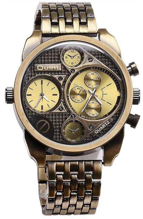 PASOY Mens Retro Style Copper Watch Big Dial 50MM Two Time Zone Military Antique Quartz Analog Watches