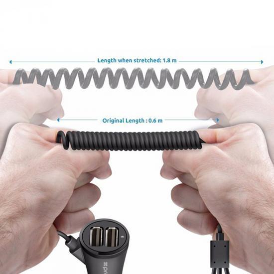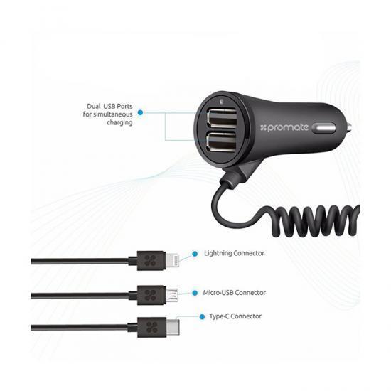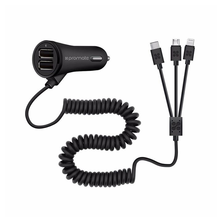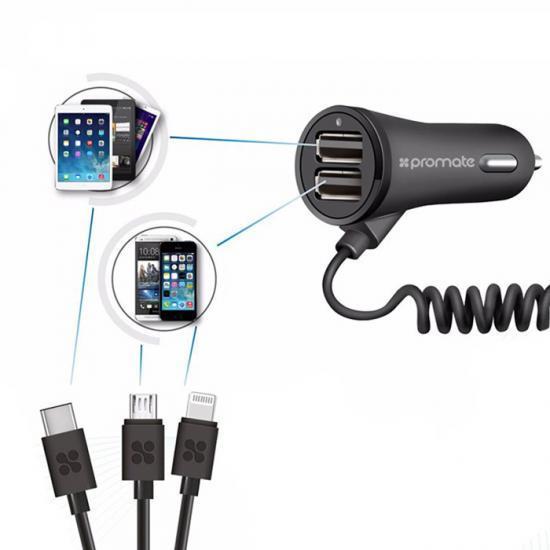 Promate Charger-Trio Car Charger with microUSB-Lightning-Type-C Cable