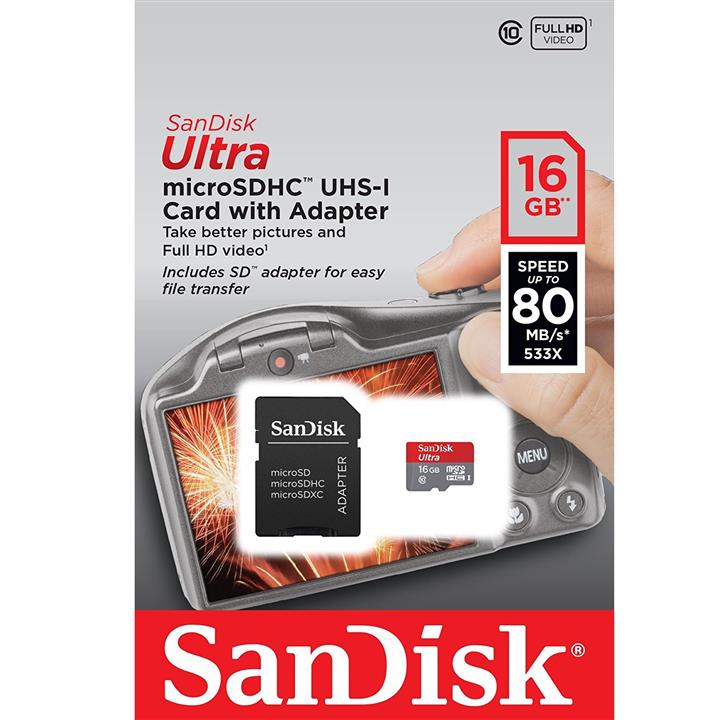 مشخصات فنی کارت حافظه SDHC سن دیسک مدل Ultra کلاس 10 استاندارد UHS-I U1 سرعت 533X 80MBps ظرفیت 16 گیگابایت