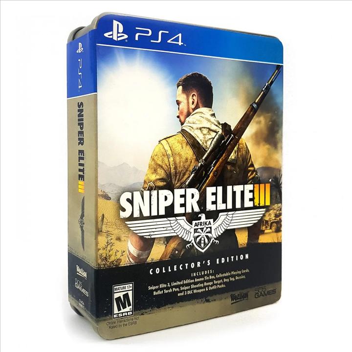 ویژگی این عنوان محتویات نسخه کالکتور بازی Sniper Elite III : باکس فلزی مخصوص- دیسک بازی - کارتهای پستال - خودکار و چراغ قوه به شکل گلوله - پلاک گردن آویز - مجموعه نقشه ها و نامه های دست نوشته - پک اختصاصی کارت بازی